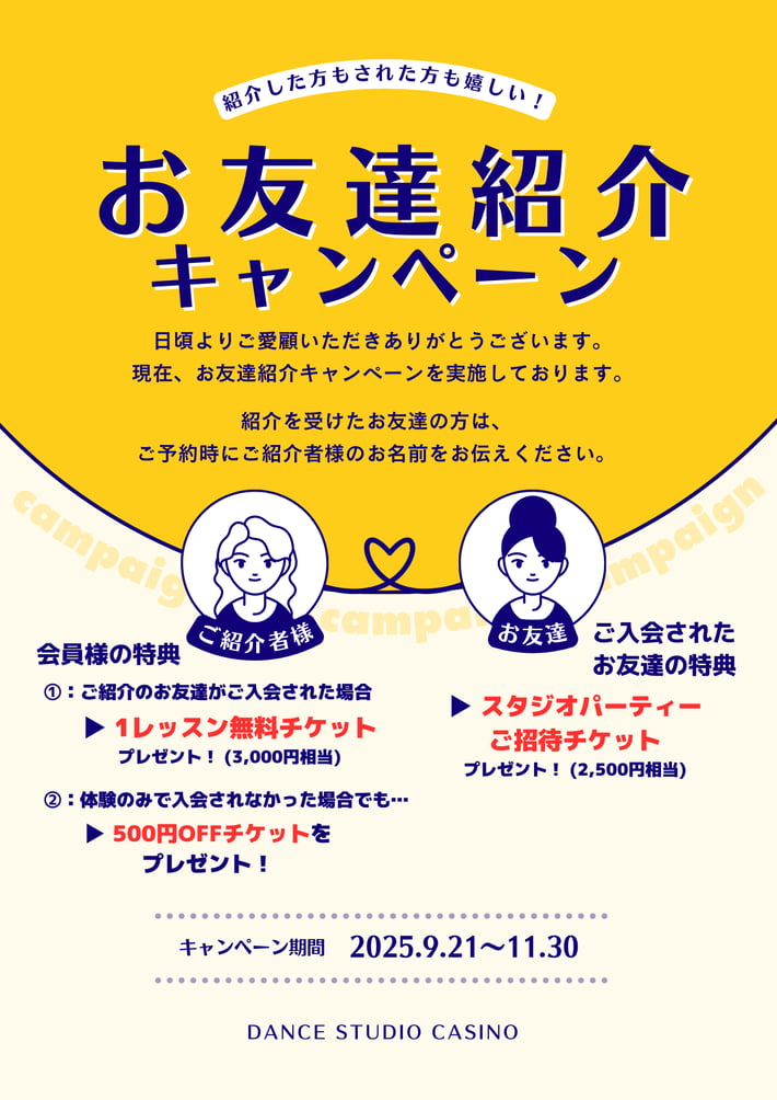 「ダンス、楽しそう!私もやってみたい!」 あなたの周りに、そう思っているご友人はいませんか? ぜひこの機会に、大切なご友人やご家族をスタジオに誘ってみませんか? 紹介してくださった会員様にも、ご入会されたお友達にも、素敵なプレゼントをご用意しました! 【キャンペーン期間】 9月21日(日) 〜 11月30日(日) <会員様の特典🎁>...
